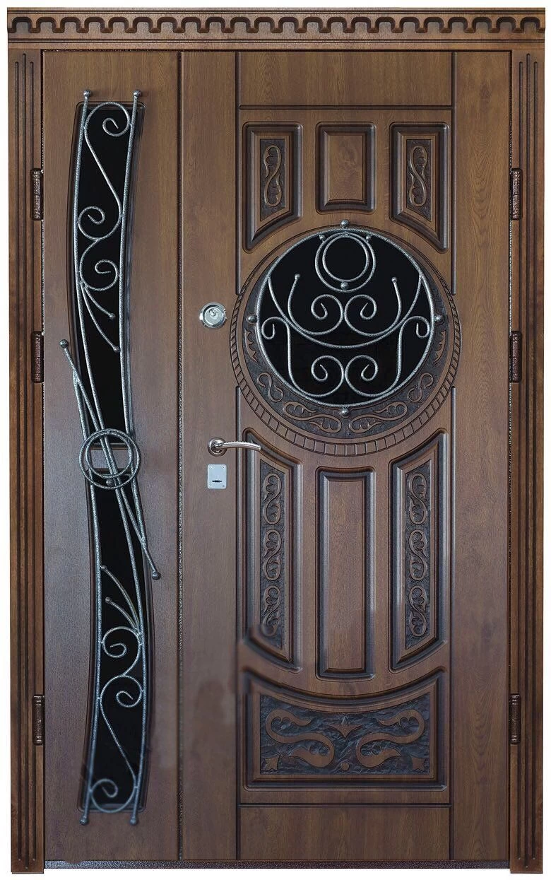 Парадные двери относятся к изделиям премиум-класса. Изготавливаются такие модели из металла толщиной не менее 2,0 мм, конструкция усиливается ребрами жесткости. Основной фактор, делающий парадные двери таковыми – их внешняя отделка. Для декора этих дверей, как правило, используют массив дуба, ясеня или сосны, натуральный шпон, корабельную фанеру, МДФ-панель, покрытую атмосфероустойчивой пленкой Винорит (VINORIT). Декоративные вставки из антивандального стекла, с применением элементов ковки, рисунок, который будет сочетаться с рисунком решеток на окнах, придаст коттеджу неповторимый внешний вид. Можно декорировать дверь витражным узором – и ваш дом заиграет яркими красками. По конструкции парадные двери могут быть как одностворчатыми, так и двустворчатым. При достаточной высоте проема, можно изготовить входную группу с декоративной вставкой сверху – прямоугольную или в виде арки. Терморазрыв в конструкции парадной двери сохранит тепло в доме, и предотвратит промерзание и кондедсирование двери в холодное время года, при этом не требуется обустройство в доме холодного тамбура.